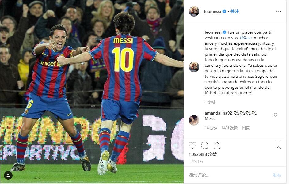 梅西在个人Ins上写道:“很高兴能与你并肩作战那么多年,我们一起有过有过很多经历。当你决定离开的那一天起我们就失去了你。回想起来,你在场内场外都给予了我们很多帮助。衷心地祝愿你在人生的新阶段一切顺利,相信你还会继续在足坛取得成功,在这里给你一个大大的拥抱!”
