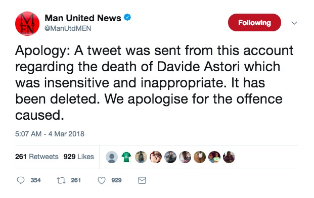 大赢家3月5日讯 昨天,佛罗伦萨中卫阿斯托里因心脏骤停在睡梦中去世。英国媒体《曼彻斯特晚报》的推特账号一则不合适的消息引发众怒。