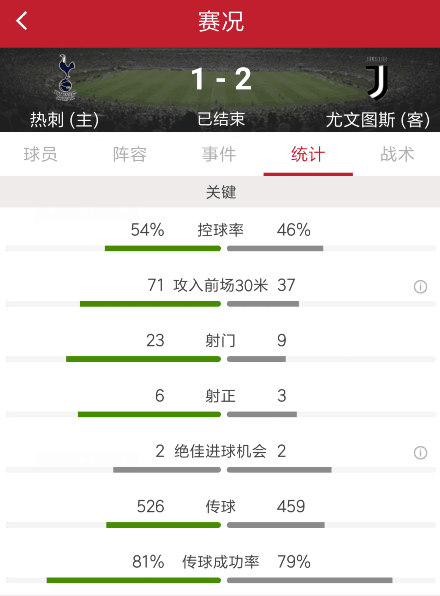热刺在控球率和射门数上占据绝对优势,然而尤文老练地把握住了两次绝佳机会,成功实现逆转。