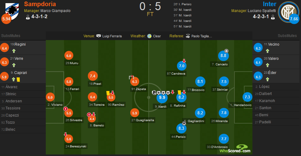 伊卡尔迪半场带帽+大四喜获得全场最高的9.9分;桑普多利亚方面,普拉特表现出色获得全队最高的7.4分。