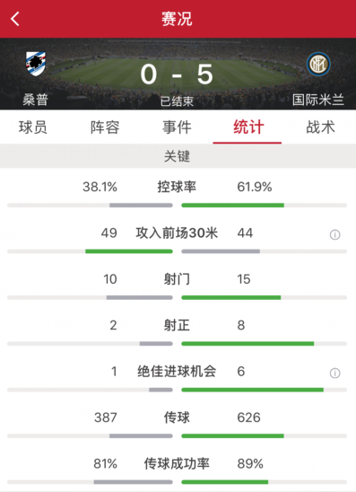 国际米兰占据绝对优势,全场控球率61.9%,桑普多利亚控球率只有38.1%,国米全场15次射门8脚射正获得6次绝佳进球机会取得5粒进球,而桑普全场10次射门2脚射正获得1次绝佳进球机会未能进球。