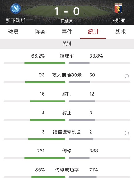 数据方面那不勒斯全场占优,不仅控球率高达66.2%,射门更是多达16脚,其中4脚射正。