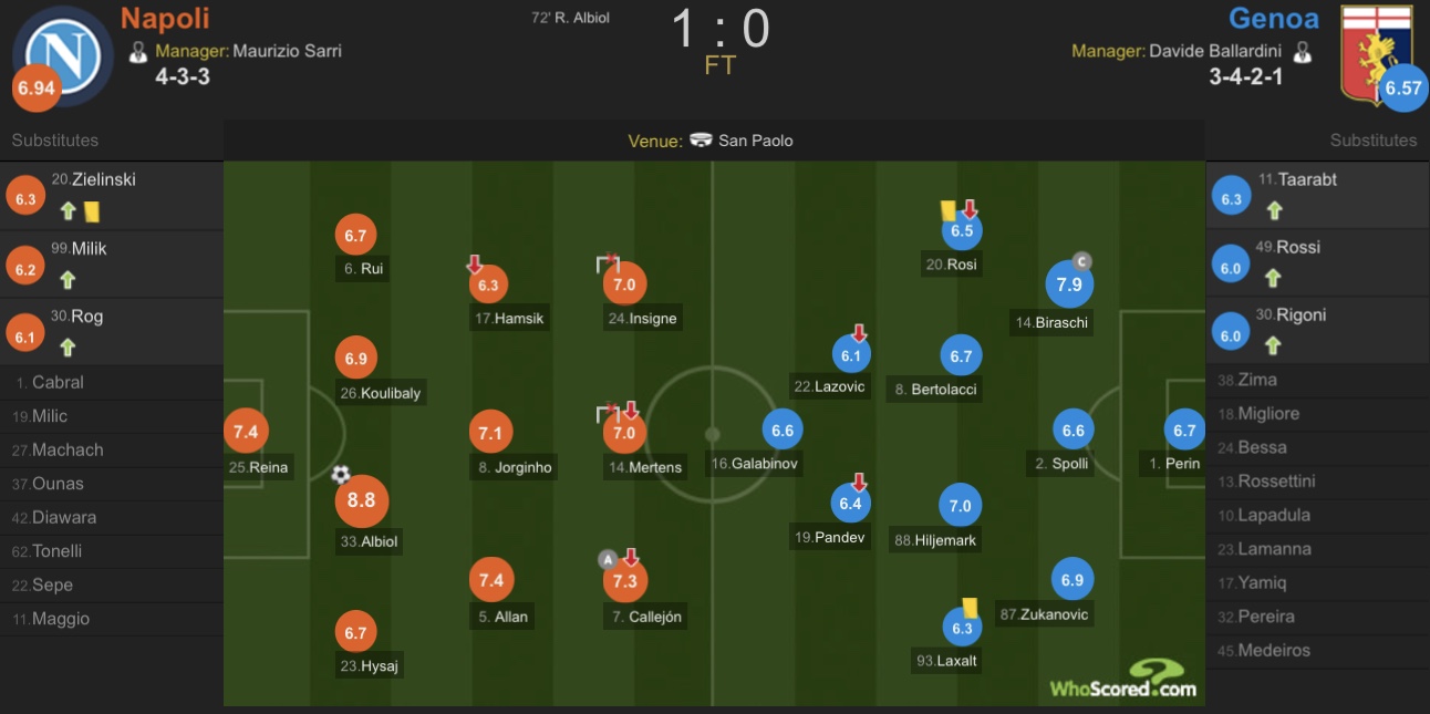 那不勒斯(4-3-3):25-雷纳、6-鲁伊、26-库利巴利、33-阿尔比奥尔、23-希萨伊、17-哈姆西克(20'杰林斯基)、8-若日尼奥、5-阿兰、24-因西涅、14-默滕斯(82'米利克)、7-卡列洪(86'罗格)