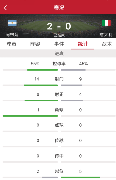 阿根廷攻势占优,全场控球率55%稍占优势,意大利控球率45%处于下风,阿根廷全场14次射门6脚射正取得2粒进球,而意大利全场9次射门4脚射正未能进球。