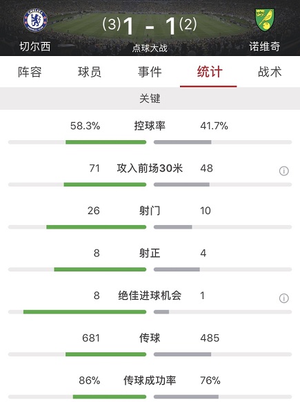 数据方面切尔西全场占优,控球达到58%,射门更是多达惊人的26脚,但只有8脚射正。