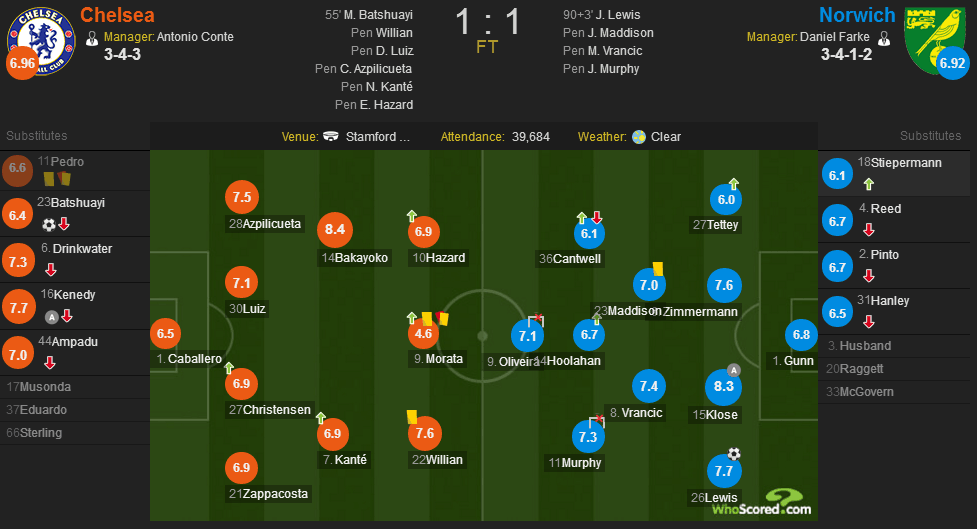 第70分钟,威廉带球杀入禁区后送出横敲,门前的德林克沃特一脚推射将球打偏。第81分钟,孔蒂率先做出调整,用此前多场比赛哑火的莫拉塔换下进球功臣巴舒亚伊。在后场也作出调整,用克里斯滕森换下本场表现中规中矩的阿姆帕杜。第83分钟,诺维奇也作出换人调整,用胡拉汉将里德换下。