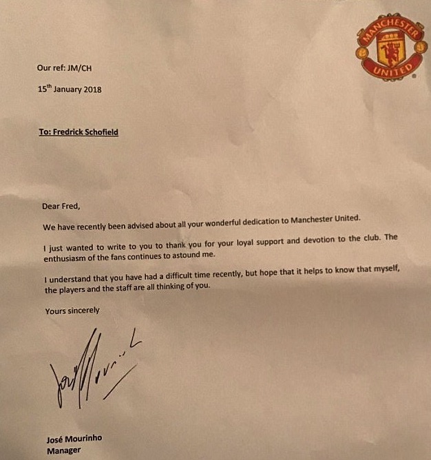 穆帅在信里写道:“我们最近听说了你为曼联的奉献,我想写信感谢你忠诚的支持以及对俱乐部的热爱,球迷的激情一直让我震惊。