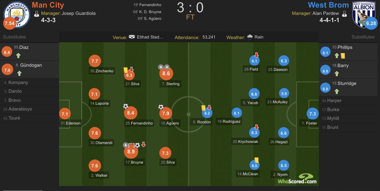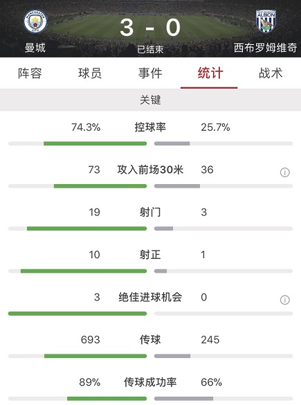 最终全场比赛结束,曼城主场3-0战胜西布罗姆维奇。