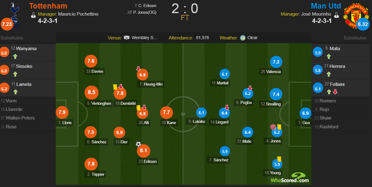 上半场,热刺主场2-0领先曼联,埃里克森闪电破门首开纪录,菲尔-琼斯自摆乌龙。