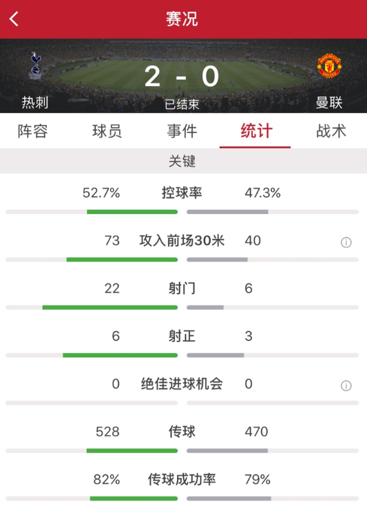 两队控球不分伯仲,热刺控球率52.7%,曼联控球率47.3%,热刺全场22次射门6脚射正,曼联全场6次射门3脚射正,两队均未获得绝佳进球机会,热刺取得2粒进球。