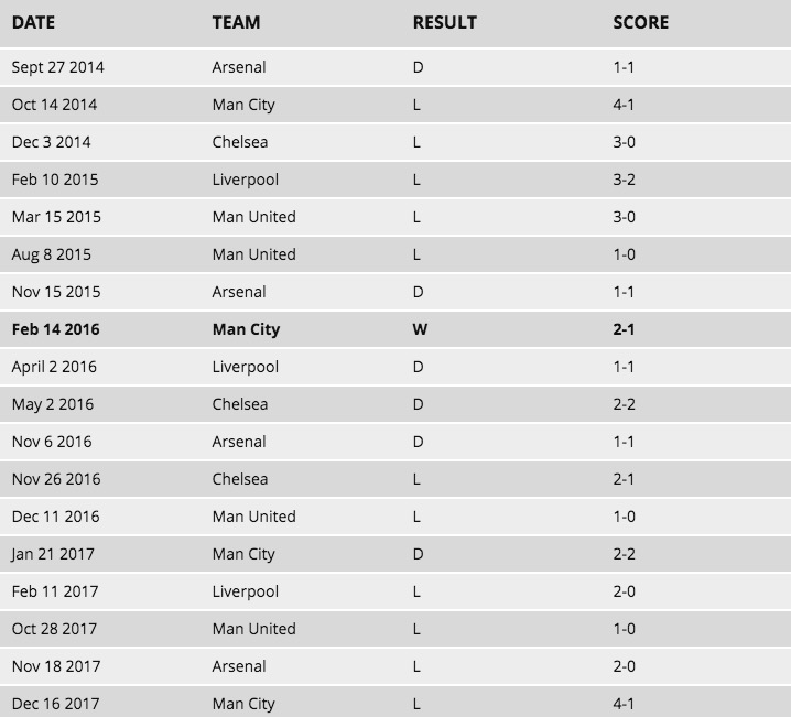 大赢家2月3日讯 热刺主帅波切蒂诺承认,热刺在客战前六球队时战绩不佳可能导致他们在过去两个赛季中争冠失败。
