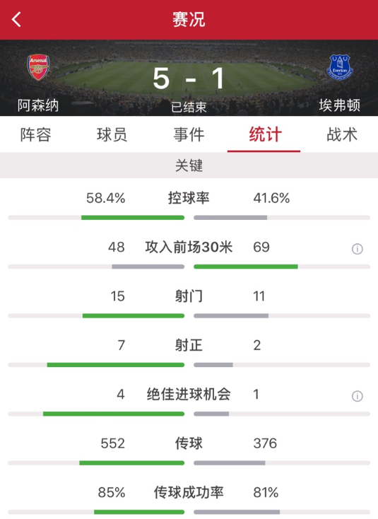 阿森纳占据控球优势,全场控球率58.4%,埃弗顿控球率41.6%,阿森纳全场15次射门7脚射正获得4次绝佳进球机会取得5粒进球,而埃弗顿全场11次射门2脚射正获得1次绝佳进球机会取得1粒进球。