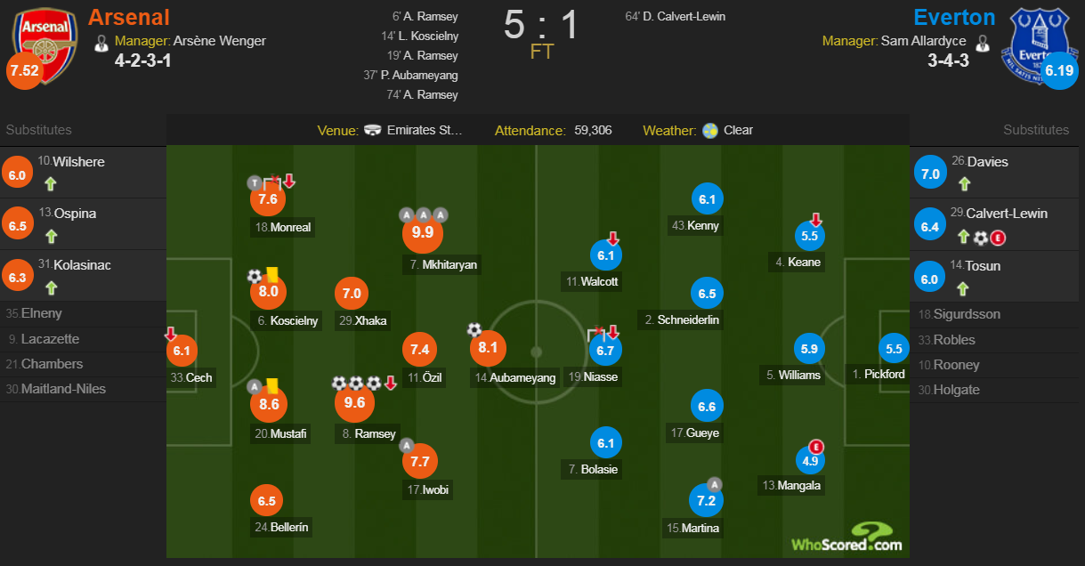 姆希塔良奉献助攻帽子戏法获得全场最高的9.9分,拉姆塞上演进球帽子戏法获得9.6分,奥巴梅扬首秀破门获得8.1分;埃弗顿方面,玛蒂纳助攻勒温破门获得全队最高的7.2分,替补出场的戴维斯得到7.0分。