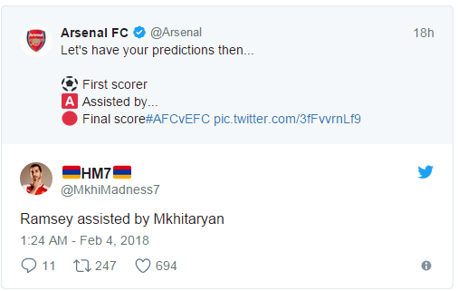 阿森纳官推在赛前发了一条推特让球迷们预测首个进球的进球者和助攻者,一名名叫“MkhiMadness7”回复道:“姆希塔良助攻拉姆塞得分。”比赛仅开始6分钟,姆希塔良真的完成助攻,帮助拉姆塞收获进球。