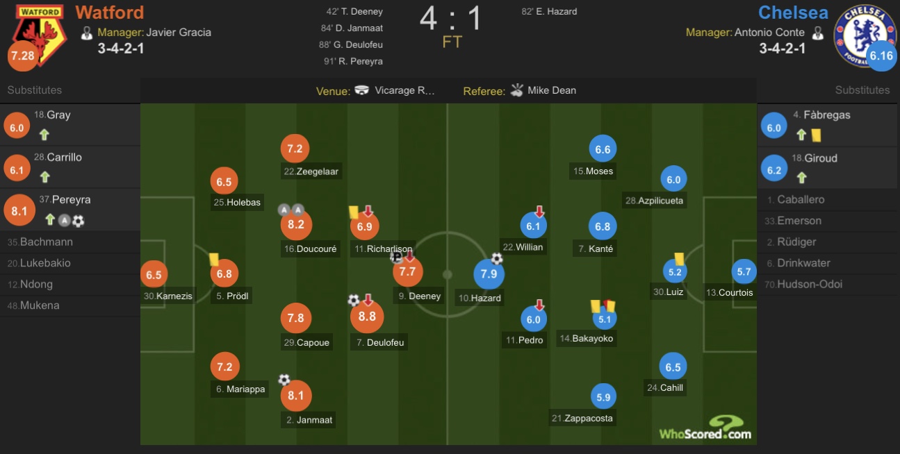 在进攻端表现活跃且攻入自己沃特福德生涯首球的德乌洛费乌收获本场比赛最高评分。