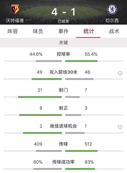 最终全场比赛结束,切尔西客场1-4不敌沃特福德。