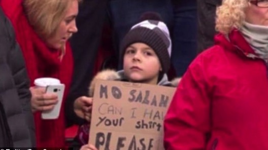 这位小球迷整场都举着一块纸牌,上面写着:“萨拉赫,能给我你的球衣吗?”