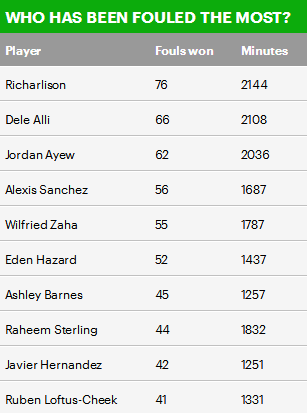 沃特福德的巴西小将理查尔里森在2144分钟的出场时间内被对手犯规76次,是被犯规次数最多的球员。托特纳姆热刺队的阿里以66次的数据排名第二。