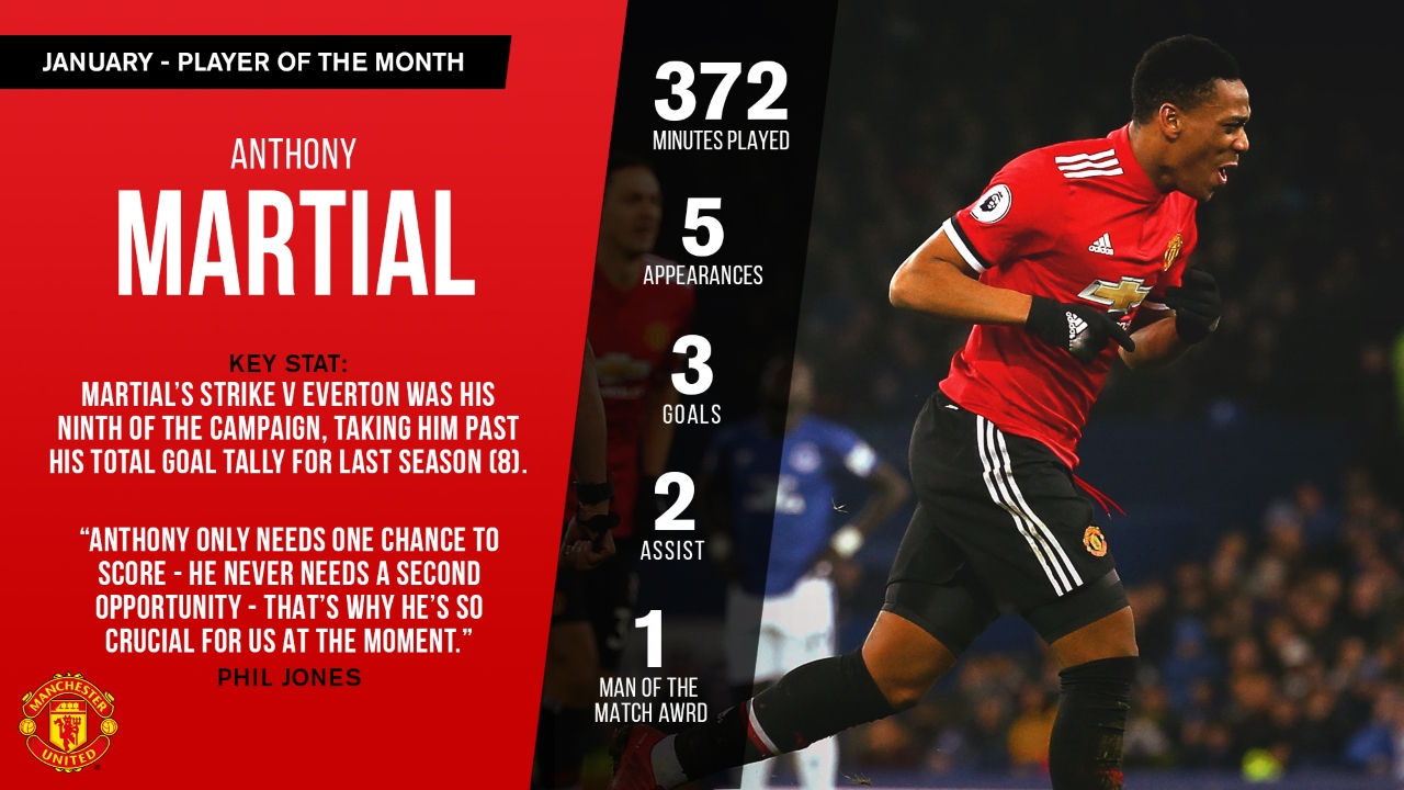 大赢家2月7日讯 曼联官网消息,法国前锋马夏尔成功当选曼联1月最佳球员,这也是法国人本赛季第三次获此殊荣。