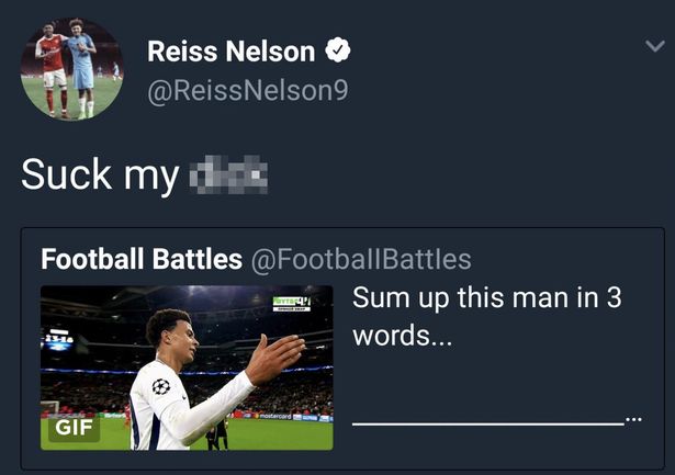 这条粗俗的推特简单地写着:“舔我的****”,它被转发用来回应一条关于热刺中场阿里的推特,他回应的那条推特配有阿里在欧冠的手势动作,并写到“用三个单词形容这个男人”。 纳尔逊的账号还发布其他的推特,包括针对其他用户骂自己是“垃圾”,他发文回复对方“闭嘴”。
