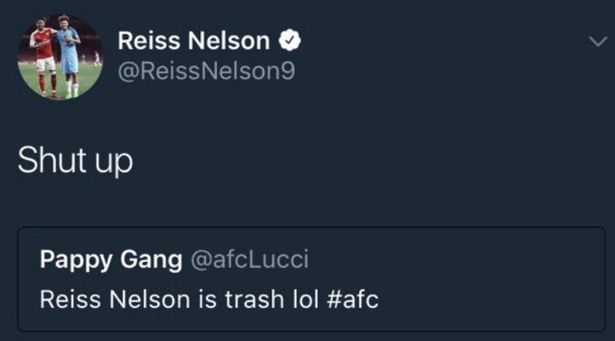 大赢家3月9日讯 阿森纳小将莱斯-纳尔逊的官方推特账号发布了一条关于阿里的粗俗推特,随后他证实自己的账号是被盗了。