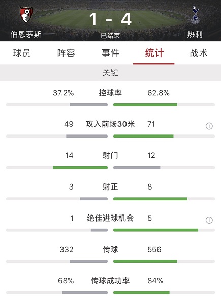数据方面热刺全场占优,控球率高达62.8%,虽然12脚的射门数略逊于14脚的伯恩茅斯,但8脚的射正数却是远高于伯恩茅斯的3脚。