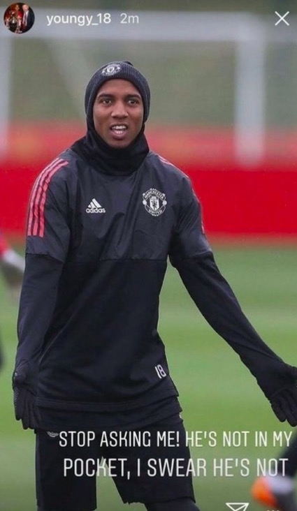 比赛后,曼联球迷在推特上笑称阿什利-扬把萨拉赫“装进了口袋”, 显然阿什利-扬也很喜欢这个玩笑,他在 Instagram 上发了一张自己在训练里摊手的照片,配文写道:“别问我了!他不在我口袋里,我发誓他不在。”——虽然阿什利-扬没有点名,但说的显然是萨拉赫。