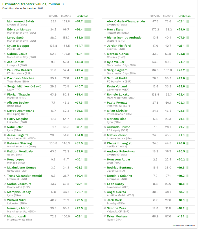 大赢家3月14日讯 根据CIES Football Observatory的最新数据显示,欧洲足坛里,本赛季从罗马转会加盟利物浦的超级前锋萨拉赫是本赛季身价上涨金额最多的球员。
