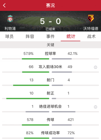 利物浦占据优势,全场控球率57.9%,沃特福德控球率只有42.1%,利物浦全场13次射门10脚射正获得1次绝佳进球机会取得5粒进球,而沃特福德全场只有4次射门1脚射正获得1次绝佳进球机会未能进球。