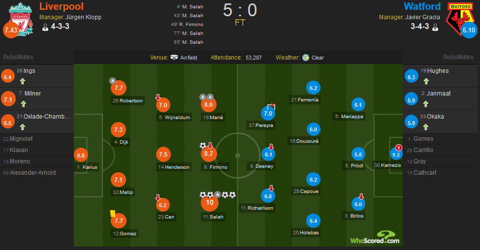 萨拉赫上演大四喜并助攻菲尔米诺破门获得全场最高的满分10分,而菲尔米诺也有一球进账获得8.7分;沃特福德方面,佩雷拉表现可圈可点获得全队最高的7.0分。