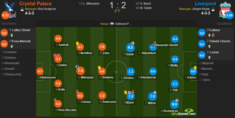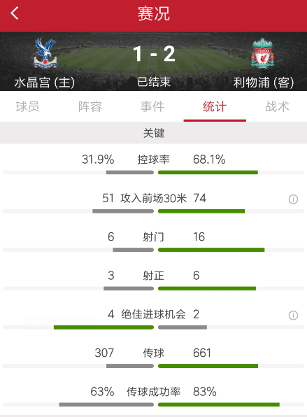 最终比赛结束,利物浦客场2-1逆转水晶宫。
