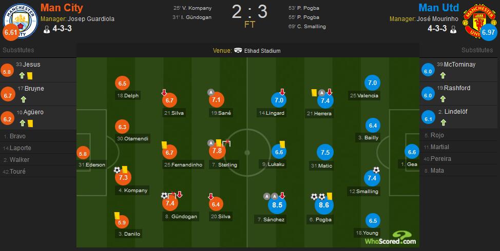 博格巴3分钟内头顶脚踢梅开二度导演大逆转获得全场最高的8.6分,桑切斯助攻梅开二度获得8.5分;斯特林助攻京多安破门并击中一次立柱获得全队最高的7.8分,京多安和孔帕尼各获得7.4分和7.3分。