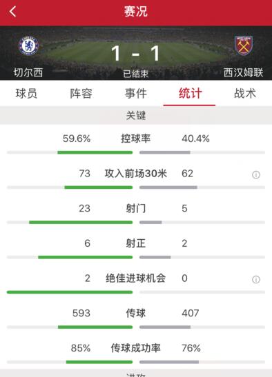 切尔西占据控球优势,全场控球率59.6%,西汉姆联控球率40.4%,切尔西全场23次射门6脚射正获得2次绝佳进球机会取得1粒进球,而西汉姆联全场5次射门2脚射正取得1粒进球。