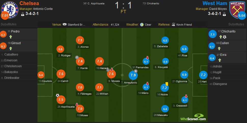 阿瑙诺维奇表现出色送出一记助攻获得全场最高的7.9分,诺布尔策动进球获得7.2分,埃尔南德斯替补破门挽救球队获得7.1分;切尔西方面,莫拉塔表现积极两进越位球并助攻队友破门获得全队最高的7.6分,阿斯皮利奎塔先拔头筹获得7.5分,阿扎尔和坎特获得7.4分。