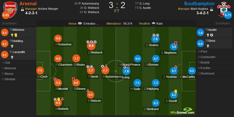 阿森纳(4-2-3-1):33-切赫、24-贝莱林(74'霍尔丁)、20-穆斯塔菲、21-钱伯斯、31-科拉希纳茨、35-埃尔内尼、29-扎卡、17-伊沃比、23-维尔贝克、61-纳尔逊(64'威尔希尔)、14-奥巴梅扬(71'拉卡泽特)