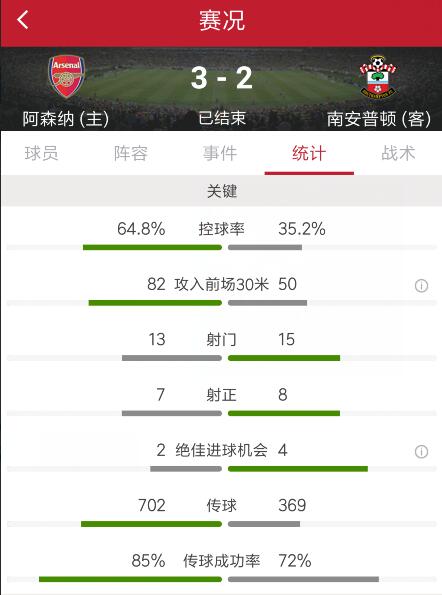 大赢家4月8日讯 北京时间4月8日晚21:00,英超联赛第33轮,阿森纳主场迎战南安普顿。 上半场比赛朗推射破门,奥巴梅扬进球将比分扳平,随后维尔贝克爆射破门将比分逆转,下半场比赛奥斯汀破门将比分扳平,维尔贝克再入一球将比分超出,补时阶段埃尔内尼和斯蒂芬斯双双被红牌罚下,最终全场比赛结束,阿森纳主场3-2战胜南安普顿。此轮过后阿森纳以26胜6平10负积54分的成绩位列第6,落后身前的切尔西2分,领先身后的伯恩利5分。