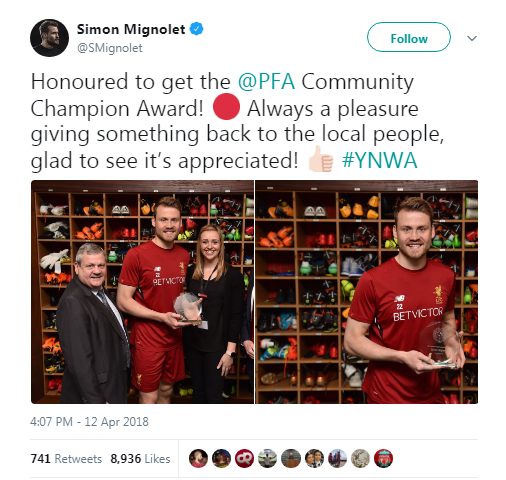 大赢家4月13日讯 英格兰职业球员工会(pfa)为利物浦门将米尼奥莱颁发了社区优胜奖杯,以此来表彰米尼奥莱对当地社区的贡献与帮助,比利时门将发推表示感谢。