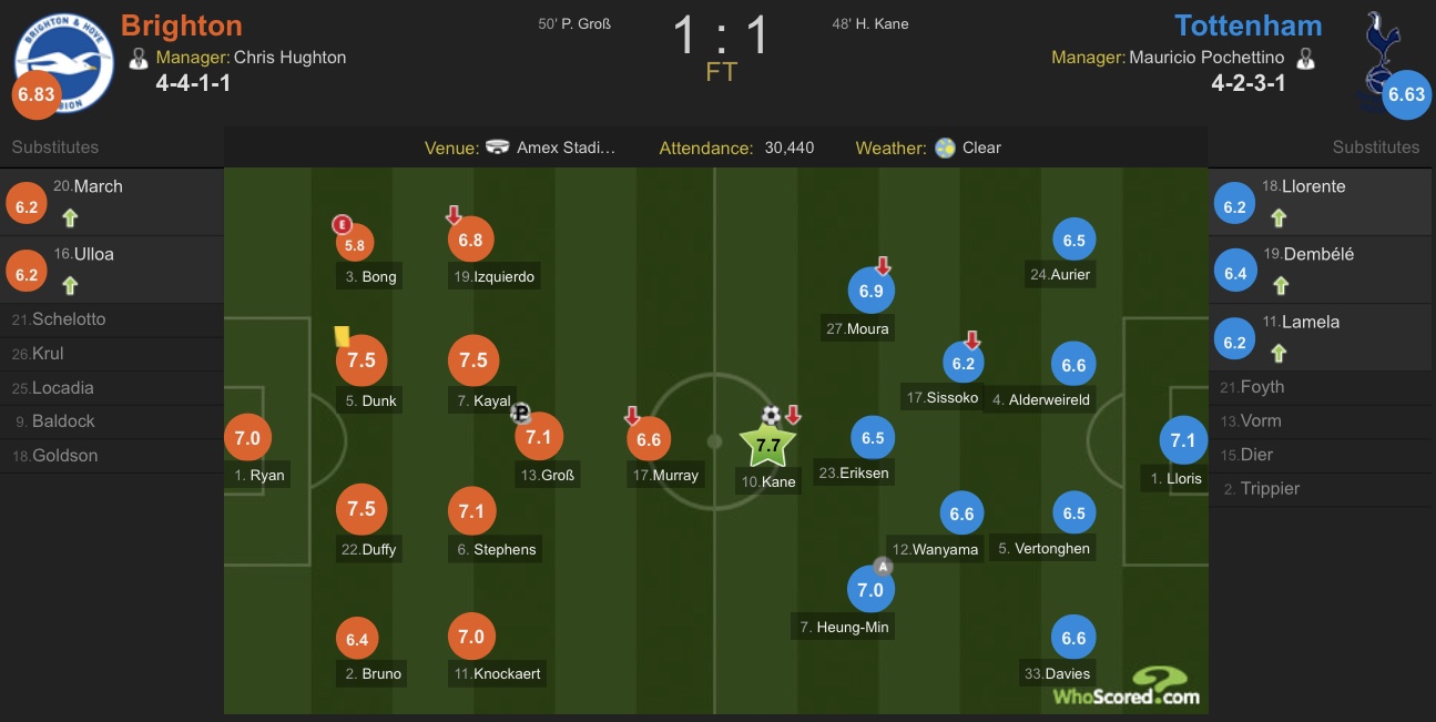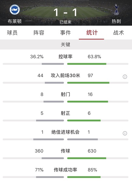 数据方面热刺全场占优,不仅控球率高达64.8%,16脚的射门数则是布莱顿8脚射门数的一倍,但是热刺本场比赛把握机会能力太差,最终没能在客场拿下对手全取三分。