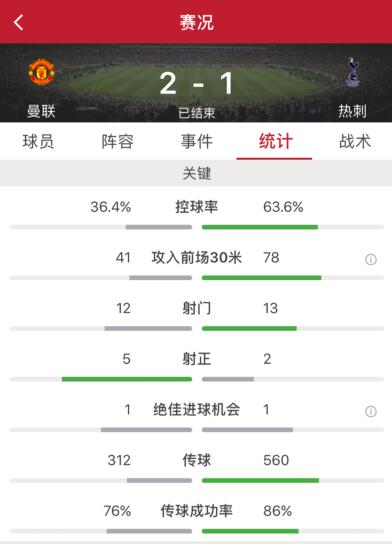 热刺占据控球优势,全场控球率63.6%,曼联全场控球率只有36.4%,热刺全场13次射门2脚射正获得1次绝佳进球机会取得1粒进球,而曼联全场12次射门5脚射正获得1次绝佳进球机会取得2粒进球。