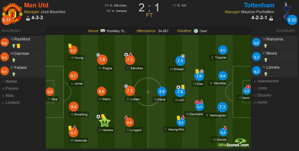 最终,曼联2-1逆转热刺,上半场,埃里克森助攻阿里先拔头筹,随后,博格巴助攻桑切斯头槌扳平比分,下半场,卢卡库助攻埃雷拉破门。