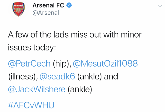 据悉,切赫是因为臀部伤势缺席比赛,厄齐尔是因病缺席这场比赛,科拉希纳茨和威尔希尔都是因为脚踝伤势缺席了这场比赛。