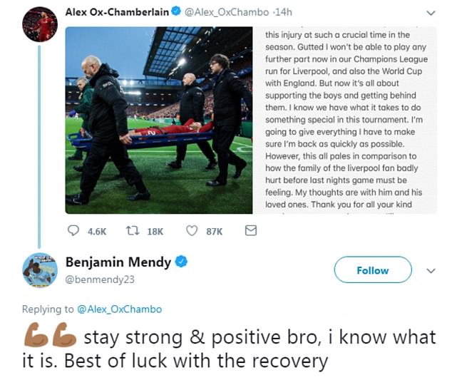 门迪本赛季初期也曾经历膝盖重伤,而他也在推特上鼓励了张伯伦,在利物浦发表张伯伦因伤赛季报销的消息之后,门迪在下面回复:“兄弟,听到这样的消息很遗憾,祝你早日康复,以更强大的姿态归来。”