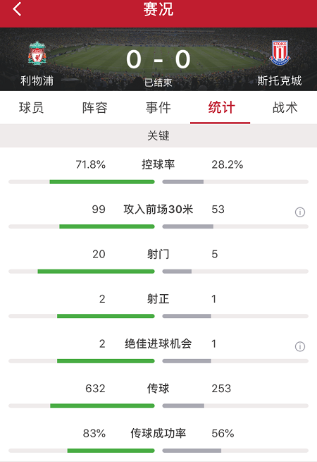 最终全场比赛结束,利物浦0-0斯托克城。
