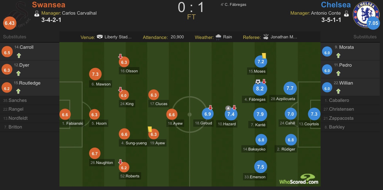 为切尔西攻入制胜球的法布雷加斯收获本场比赛最高评分,表现稳健的坎特评分紧随其后。