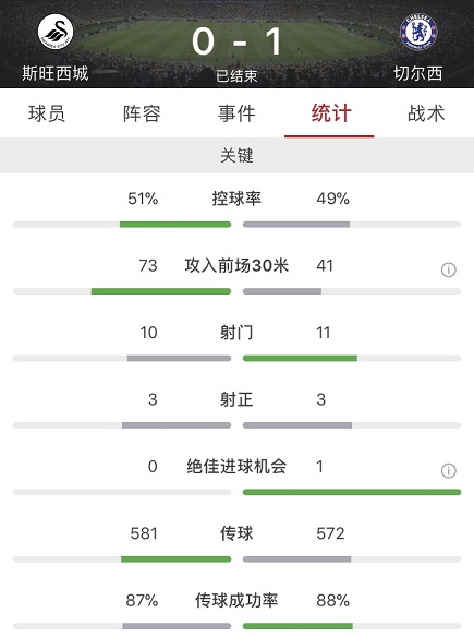 最终全场比赛结束,切尔西客场1-0斯旺西城。