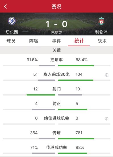 利物浦占据控球优势,全场控球率68.4%,切尔西全场控球率31.6%,利物浦全场10次射门5脚射正未能进球,而切尔西全场12次射门4脚射正取得1粒进球。