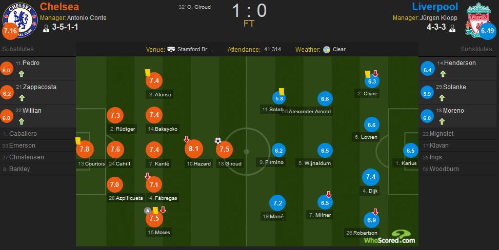 阿扎尔表现活跃多次创造杀机获得全场最高的8.1分,库尔图瓦高接低挡力保城池不失获得7.8分;利物浦方面,范戴克防守稳固获得全队最高的7.4分,马内两造威胁获得7.2分。