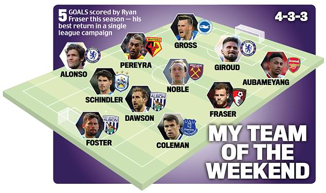 中场:弗雷泽(伯恩茅斯)、诺布尔(西汉姆联)、佩雷拉(沃特福德)