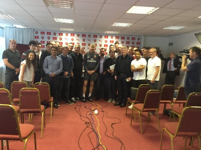 大赢家5月10日讯 22年的枪手生涯即将结束,阿尔塞纳-温格出席了自己作为阿森纳主教练的最后一场赛前新闻发布会,时光荏苒,温格已经出席了22年的新闻发布会,而作为留念,他今天也和来访的所有记者进行了合照。