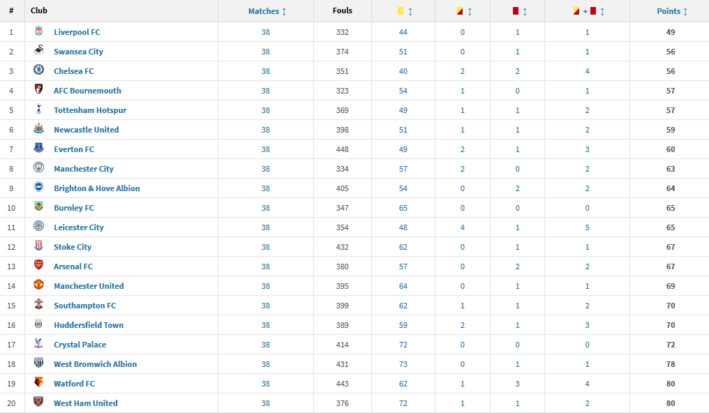 本赛季的38场英超比赛,利物浦拿到了44张黄牌和1张红牌。球队也凭借这样优异的球场作风,拿到了联赛的公平联赛竞技奖。上赛季利物浦拿到了54张黄牌,没有拿到红牌,也拿到了联赛公平竞技奖。切尔西排在第二名,斯旺西排在第三名。